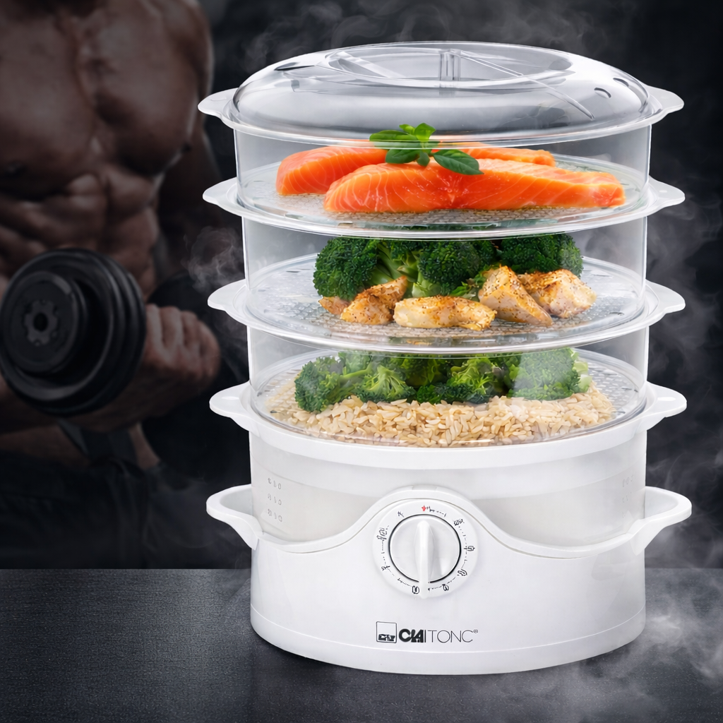 🥦 طهي صحي بالبخار بدون زيت🐟 3 سلال بخار قابلة للتكديس لطهي عدة أطعمة في نفس الوقت🍚 وعاء خاص لطهي الأرز⏱️ مؤقّت حتى 60 دقيقة لسهولة التحكم💧 توزيع متساوٍ للبخار لطهي متجانس🧼 سهل التنظيف وعملي للاستعمال اليومي